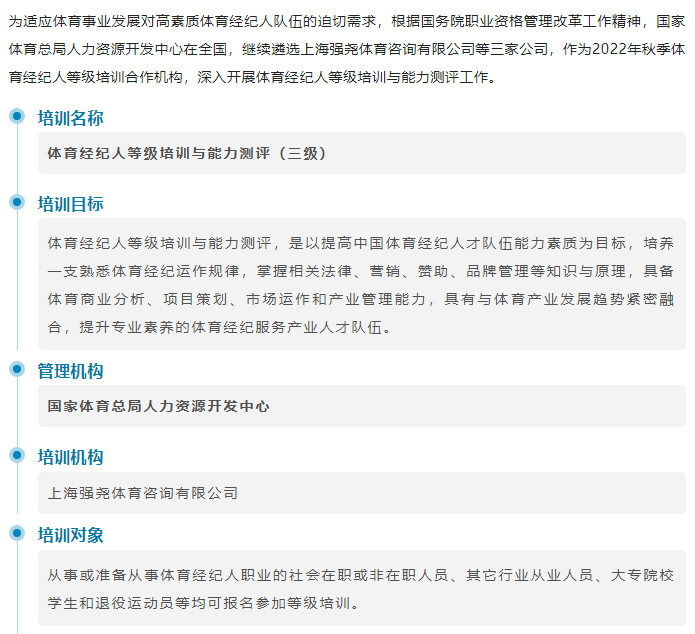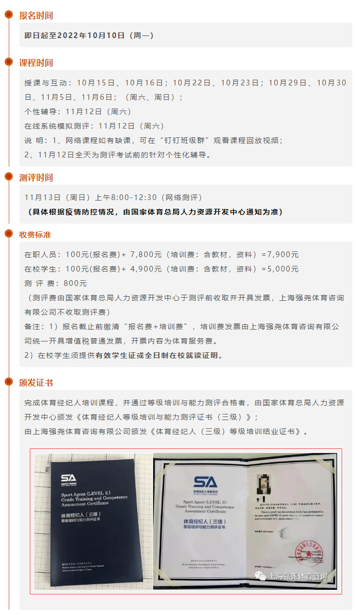 2022年體育經(jīng)紀(jì)人等級(jí)培訓(xùn)與能力測(cè)評(píng)培訓(xùn)班(上海站)秋季招生簡(jiǎn)章